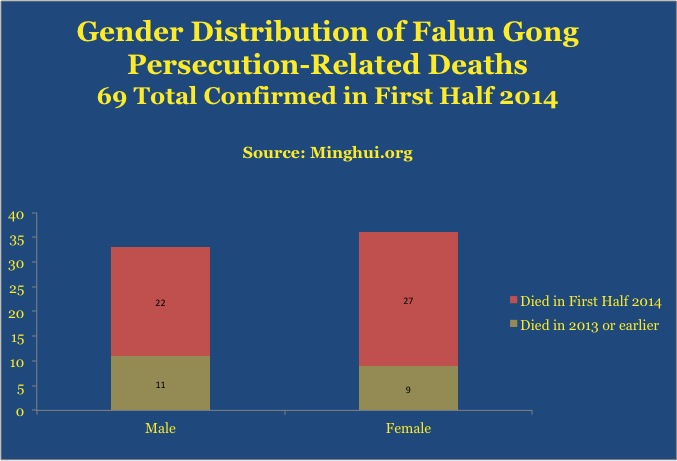 (Minghui.org) Sixty nine new death cases of Falun Gong practitioners have been confirmed during the first half of 2014. Among them, 49 deaths occurred in 2014. 20 practitioners died in 2013 or earlier, but the cases were confirmed as of June 28, 2014.