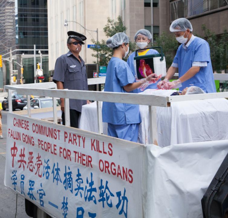 Falun Gong practitioners hold a mock organ harvesting exhibit