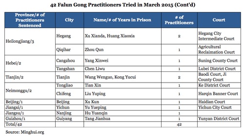 (Minghui.org) According to statistics from this website, 405 arrests of Falun Gong practitioners were confirmed in China for March 2015, with 123 tried, and 81 illegally sentenced.