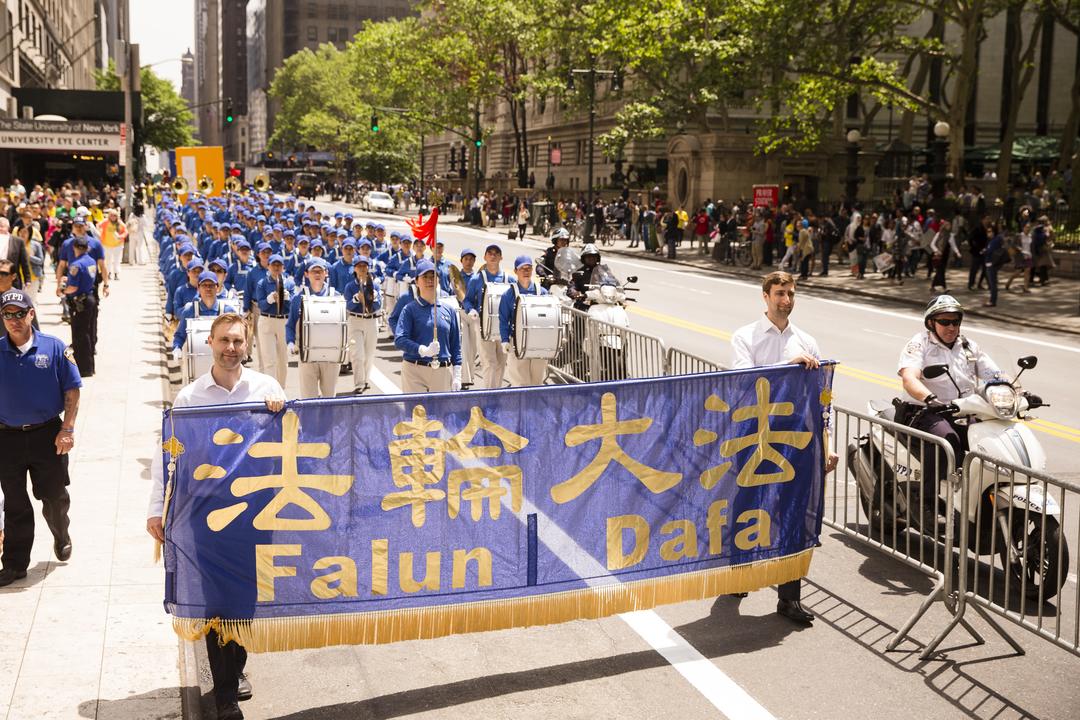 The Divine Land Marching Band marches behind the Falun Dafa banner.