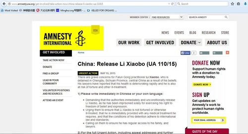 Amnesty International issued an “Urgent Action” appeal for the release of Li Xiaobo, a Falun Gong practitioner jailed for his beliefs, on May 19, 2015.