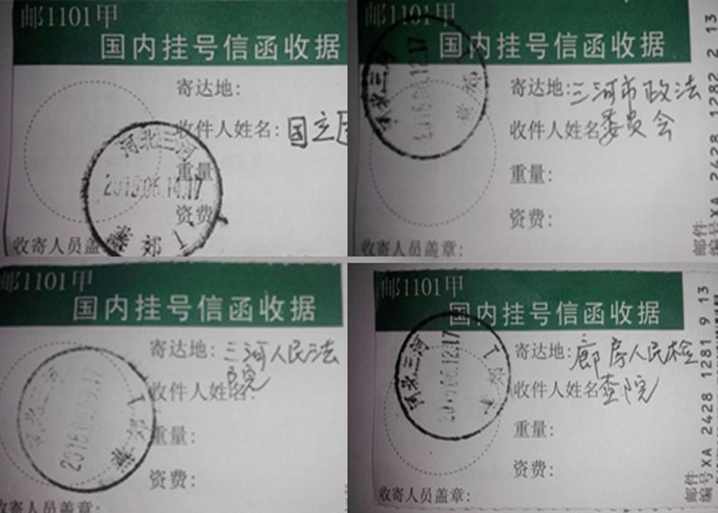 Receipt of registered mails to government agencies in Sanhe, Hebei