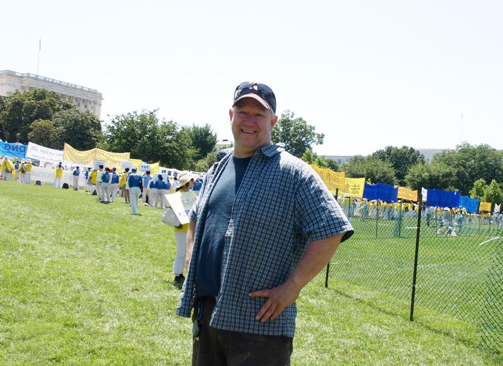 James Lewis from Buffalo, New York, drove to D.C. because his Falun Gong practitioner wife and mother-in-law wanted to attend this rally. Even though he only slept for a few hours the night before, he still came to the rally to show support.
