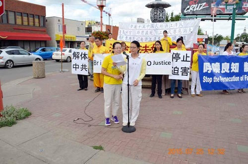 (Minghui.org) Falun Gong practitioners in Edmonton, Canada, held a rally in Chinatown on July 25, 2015, to support the many lawsuits filed against former Chinese leader Jiang Zemin. Parliament Member Brent Rathgeber, former chair of the Parliamentary Friends of Falun Gong, and John Kmech, a representative from Amnesty International, spoke at the rally.