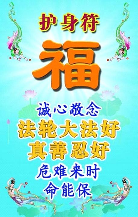 A typical truth-clarification card made by practitioners in China. The words say:“Falun Dafa is good, Truthfulness-Compassion-Forbearance is good. Repeat these words sincerely and your life will be saved when in danger”