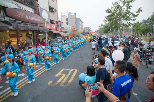 In addition to the band, the Falun Dafa entry also featured “Heavenly Maidens” and a waist drum performance. Ms. Lan, secretary-general of the organizing committee, said that Falun Dafa practitioners were specifically invited and lined up to lead the parade.