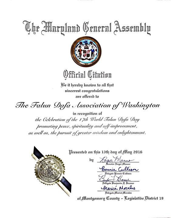 The joint official citation from Senator Roger Manno and Delegates Bonnie Cullison, Benjamin F. Kramer and Marice Mozales recognizes the celebration of World Falun Dafa Day for “promoting peace, spirituality and self-improvement, as well as, the pursuit of greater wisdom and enlightenment.”