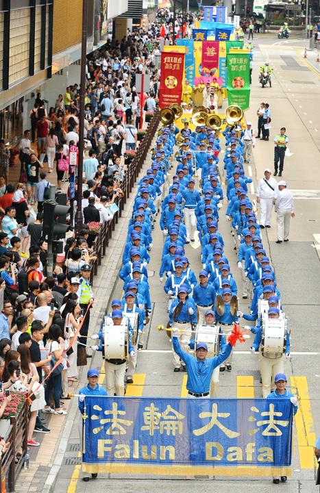 (Minghui.org) Falun Gong practitioners from Hong Kong held a grand march on May 8 to celebrate the 17th World Falun Dafa Day and the 65th birthday of Master Li Hongzhi, the founder of Falun Gong.