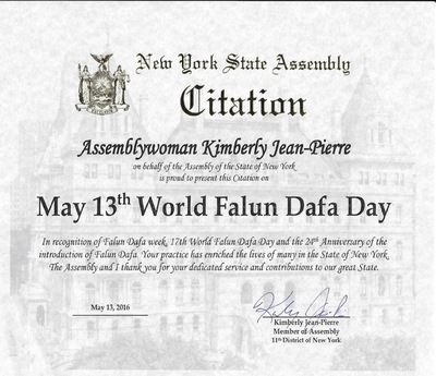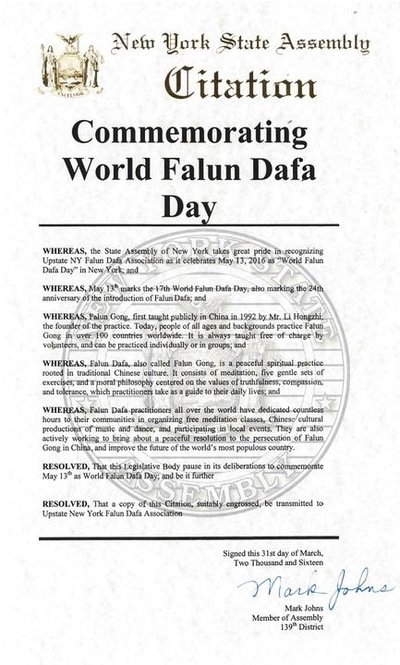 (Minghui.org) This May marks the 17 th annual celebration of World Falun Dafa Day – a joyous occasion to reflect on the many benefits that Falun Dafa has brought to the world. While the holiday is especially important to Dafa practitioners, friends and supporters around the world have also taken note of the importance of this celebration. Sixty-two State Assembly Members from New York have recently sent letters of congratulation and issued proclamations in honor of Falun Dafa, praising the universal values of Truthfulness-Compassion-Forbearance and Falun Dafa's positive impact on society.