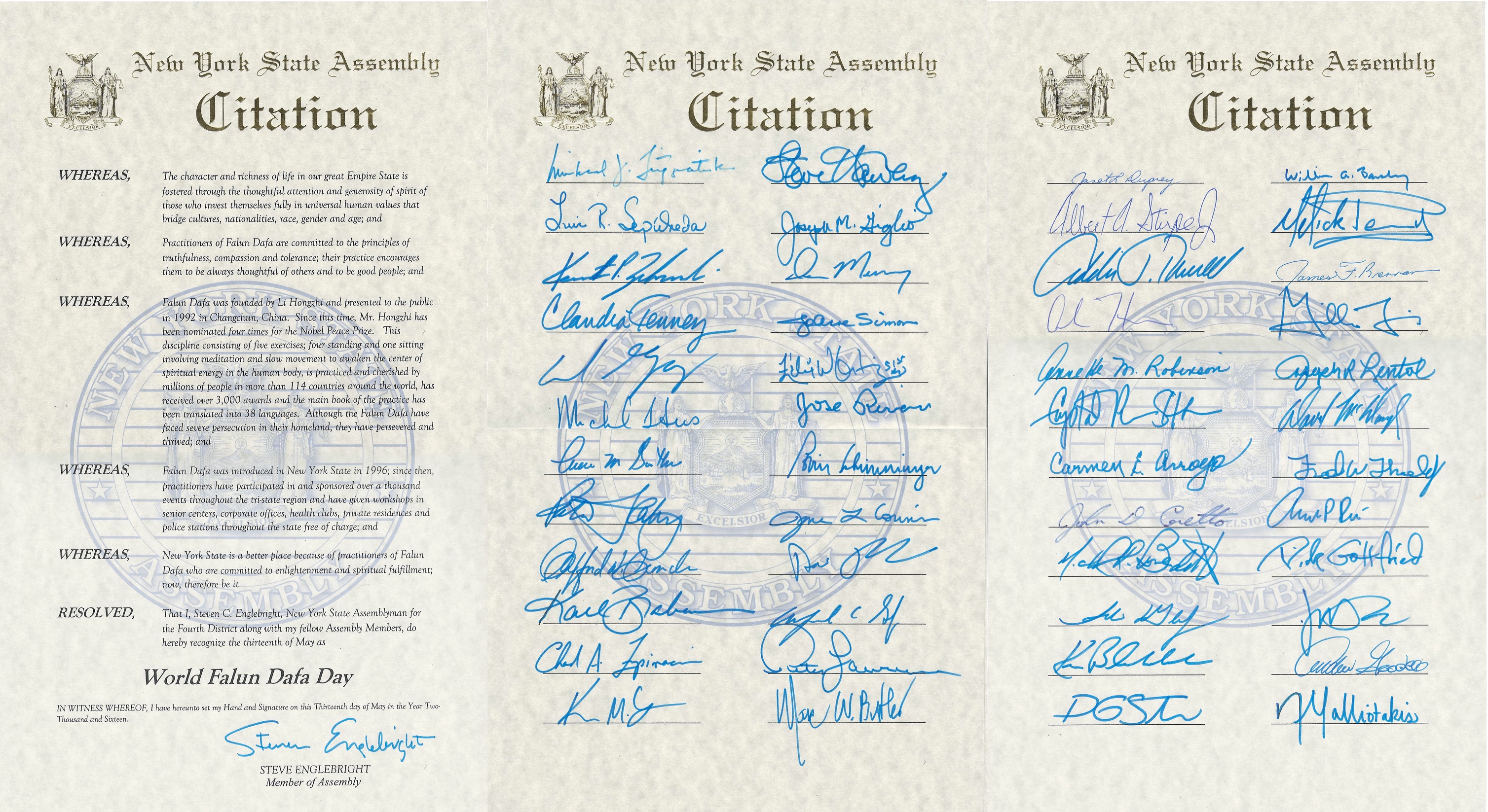 Citation in honor of Falun Dafa Day, proposed by Steven Englebright and co-signed by 48 New York State Assembly Members.