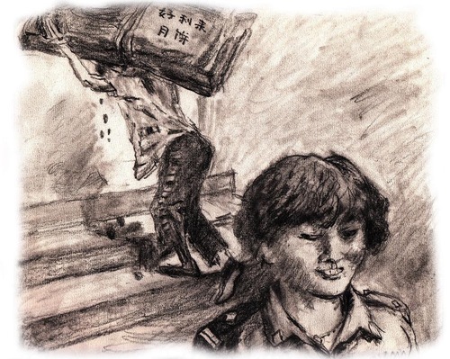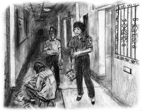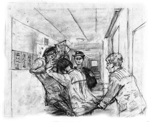 Drawing 3: The guards tried to stop her from mailing her complaint; the piece of paper in her hand reads “A letter of complaint.”