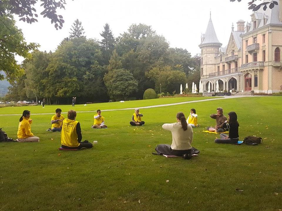 Falun Dafa practitioners in German-speaking Switzerland gathered at a castle park in the idyllic town of Thun, Switzerland, on the eve of the Mid-Autumn Festival on Sunday. They studied the Fa and did the exercises together and wished Master a Happy Mid-Autumn Festival: “We thank Master for His compassion!”
