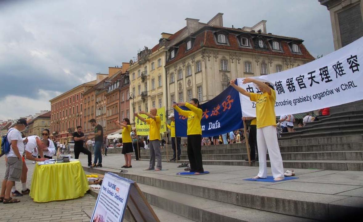Practitioners held more activities in Warsaw Old Town in the afternoon. Many people took pictures of their display boards, and there was a line of people queuing up to sign the petition to condemn forced organ harvesting.