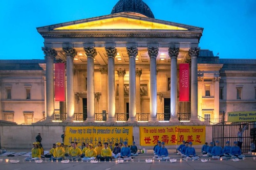 Following a rally and parade on July 22, practitioners held a candlelight vigil on Trafalgar Square in London on the evening of July 23, mourning their fellow practitioners who have died as a result of persecution and calling for a stop to these atrocities.