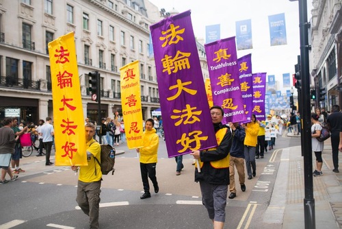 Practitioners and the European Tian Guo Marching Band rallied in front of the Chinese Embassy in London and marched in central London on the morning of July 23.