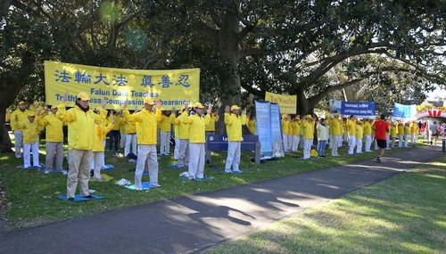 This year, the run was held on Sunday, August 13. Practitioners set up banners on Rose Bay, a main street in Sydney, and demonstrated the exercises.