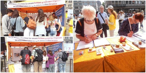 Mossomiah, a student from Italy, who studies music in Düsseldorf, was sightseeing in Cologne with his girlfriend Michelle. After listening to the practitioners talking about their experiences of being persecuted, and reading the display boards, he said, “This (persecution) is inhumane!” His girlfriend added, “It's genocide.” He continued, “There is so much going on in the world, yet high-level politicians pay little attention to human rights, and it is hard to learn the facts.” Both signed the petition and thanked practitioners for informing them of the facts.