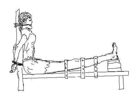 Guard Zhao Chunyan instigated criminals to torture Ms. Du. They tied her hands to a tiger bench and put shackles on her. The inmates then beat and kicked her. Two of them jumped on Ms. Du's chest. Blood gushed out of her mouth and sprayed the wall. She fainted immediately.