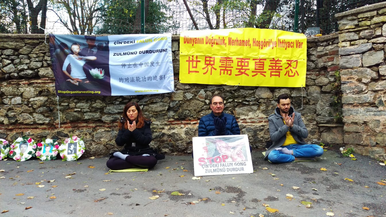 Practitioners meditating in front of Istanbul’s Chinese Consulate.