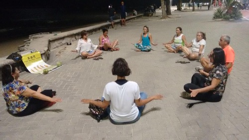 Teaching the Falun Dafa sitting meditation on a beach in Joao Pessoa.