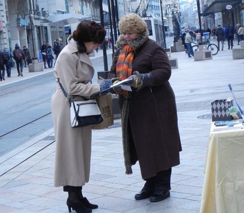 (Minghui.org) Even though the recent winter storm brought temperatures in Geneva to below freezing on February 28, Falun Dafa practitioners in the French speaking areas of Switzerland persisted with their signature drive on Geneva's famous Rue du Marché. The campaign was met with warm support from passersby.