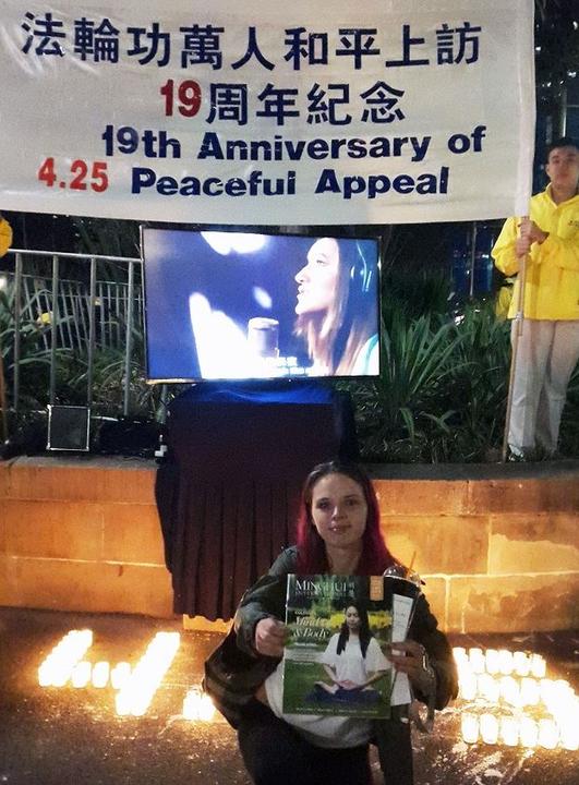 Abaylee Jeoffray, a local student, believes that Falun Gong's principles of Truthfulness-Compassion-Forbearance will bring peace to the world.