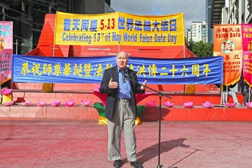 Peter Westmore, Chairman of the Australian National Citizenship Committee, speaking in the rally. He said that he respected the principles of Truthfulness-Compassion-Forbearance that Falun Gong practitioners follow.