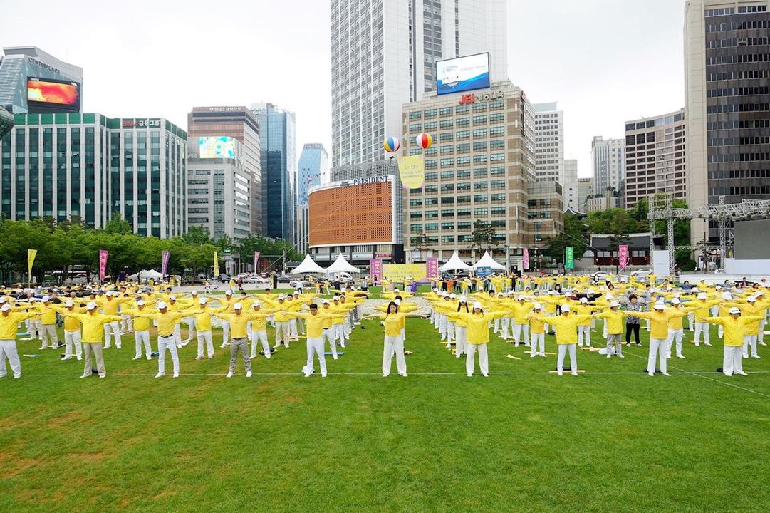 Peaceful demonstration of the Falun Dafa exercises at City Hall Square in Seoul, in celebration of World Falun Dafa Day.