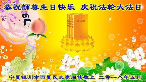 Two practitioners from a family in Jiangsu Province wrote in their greeting, “Our gratitude towards Master is beyond words. We will continue studying the Fa, doing the exercises, improving our mind nature, as well as telling others about Falun Dafa and sending forth righteous thoughts.”