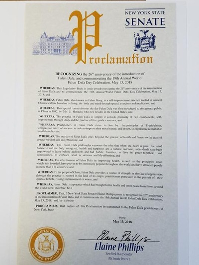 Senator LaValle's proclamation congratulated the World Falun Dafa celebrations and recognized that Falun Dafa “is guided by the principles of Truthfulness, Compassion, and Tolerance as part of the universal human values that bridge cultures, nationalities, race, gender, and age,” and, “Falun Dafa is practiced and cherished by millions of people in more than 114 countries around the world; It has received over 3,000 awards and its main book of practice has been translated into 38 languages,”