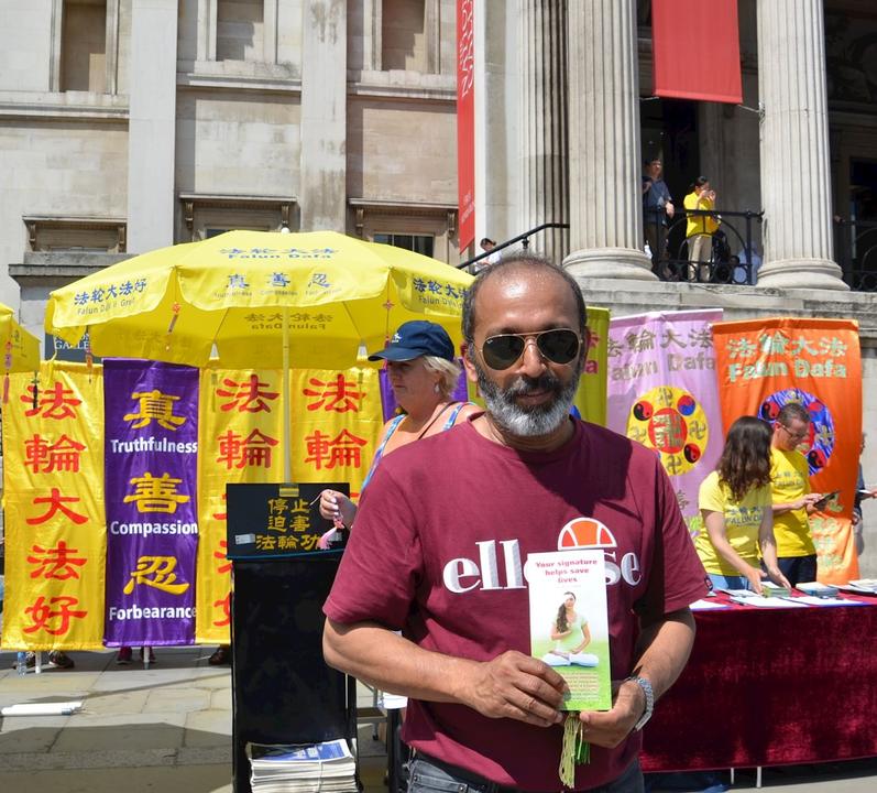 Mr. Vinod Kurup is a nursing manager at a hospital in London. He saw Falun Gong's exercise demonstration in Chinatown one year ago, heard about the persecution, and signed a petition. After seeing Falun Gong again at Trafalgar Square, he came to the table and signed a petition supporting Falun Gong again. He said, “The persecution of Falun Gong is wrong. They are peaceful and merely expressing their opinions. I support Falun Gong!”