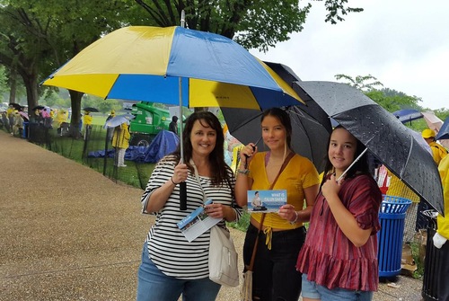 Monica from Canada and Kitty from Florida, who were traveling together, saw many people in bright yellow T-shirts at their hotel. When they encountered yellow T-shirts again at the Washington Monument, they were curious and asked about the event. They said it was great that practitioners were raising awareness at the Monument.