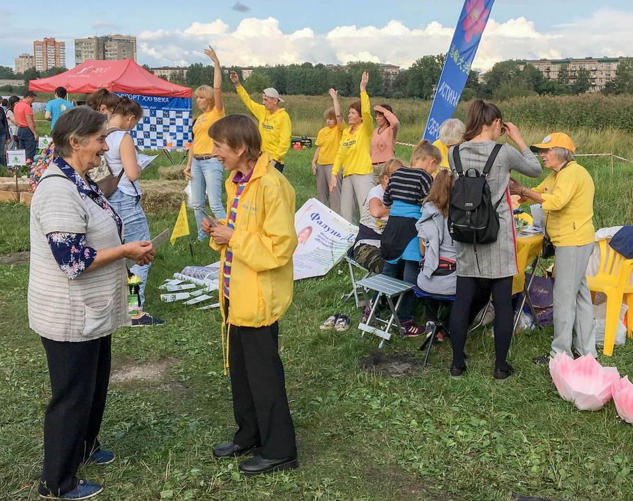 (Minghui.org) Falun Gong practitioners participated in a city festival at Ivanov Park in St. Petersburg at the beginning of September. Over 8,000 people attended the event. Upon learning about the persecution of Falun Gong in China, many visitors encouraged practitioners to continue their efforts to raise public awareness about the atrocities in China. Others wanted to learn the Falun Gong exercises.
