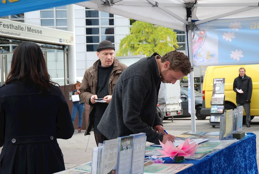 (Minghui.org) Falun Gong practitioners from Frankfurt and surrounding cities set up a booth at the Frankfurt Book Fair on October 16-20, 2019 and informed people about the persecution in China.