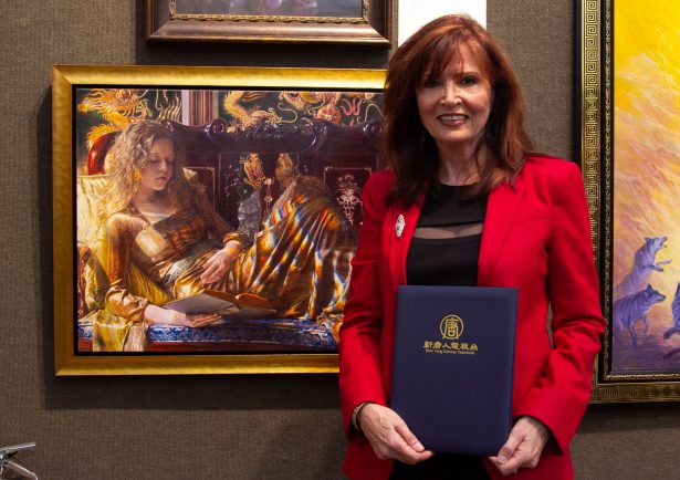 NTD Television CEO John Tang presents a medal and an award certificate to the gold award winner, Kong Haiyan, in front of her work “April 25, 1999.”