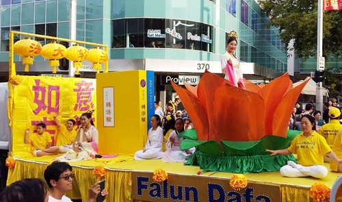 The Falun Gong procession featured a float, celestial maidens, waist drums, and the Tian Guo Marching Band. Spectators, who complimented the music and colorful costumes, also showed an interest in learning more about the practice of Falun Gong and its persecution by the communist regime in China.