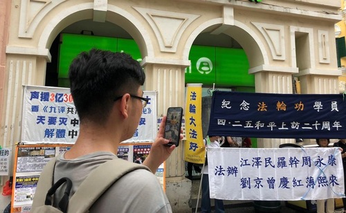 When Falun Gong practitioners in Macau held up large banners with the words “Commemorating the 20th Anniversary of Falun Gong Practitioners' April 25th Peaceful Appeal,” “Bring Jiang Zemin, Luo Gan, Zhou Yongkang, Liu Jing, Zeng Qinghong, and Bo Xilai to Justice,” and “Falun Dafa is Good,” a large number of tourists and residents did not hesitate to read the banners and posters exposing the CCP's crimes.