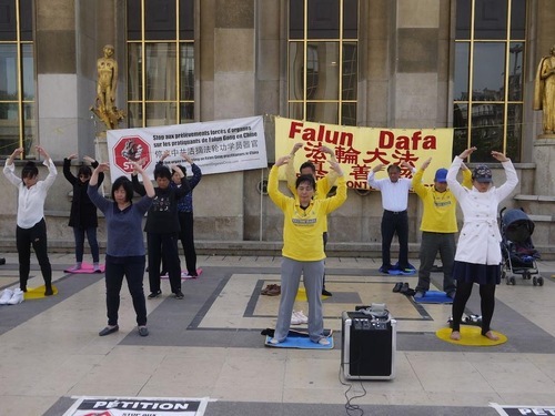 Falun Gong practitioners do the exercises on the Champ de Mars.