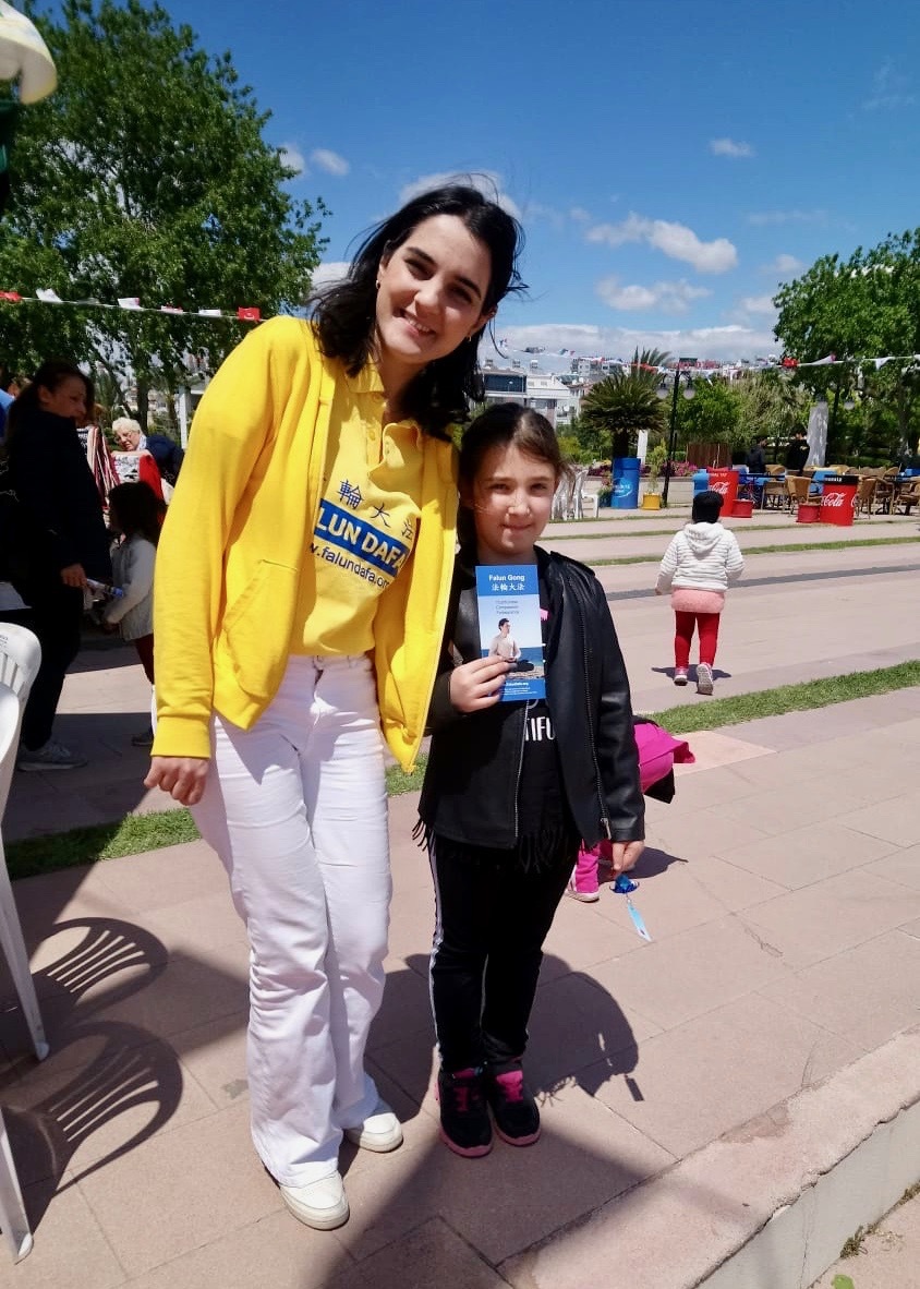 When Begüm Borçetin saw Falun Dafa, she said she believed it was no accident that she came across this booth. She lives in Poland and was in Turkey visiting family. She learned the Falun Dafa exercises right away. When she heard the principles of Falun Dafa, Truthfulness-Compassion and Forbearance, she was moved to tears. She said that she would attend the regular local practice site to continue learning the practice.