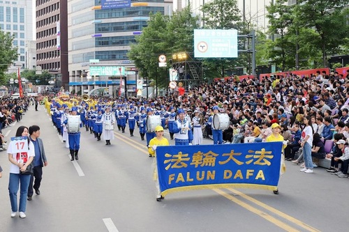 (Minghui.org) Falun Gong practitioners in Korea participated in the 2019 Colorful Festival Parade in Daegu on May 4th. Both the spectators and the parade organizers had high praise for the Tian Guo Marching Band, Falun Gong exercise demonstration, celestial maiden float, and waist drums.