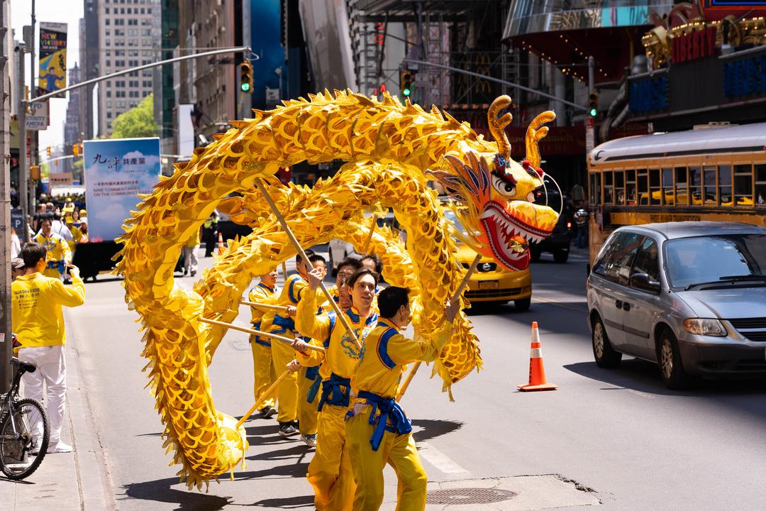 The Tian Guo Marching Band coming down New York's busiest street – 42nd Street in New York – on May 16, 2019
