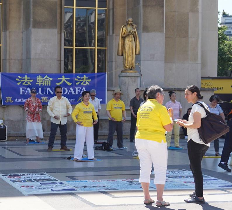Practitioners display information and talk to tourists at Human Rights Plaza near the Eiffel Tower on Sunday, June 2.