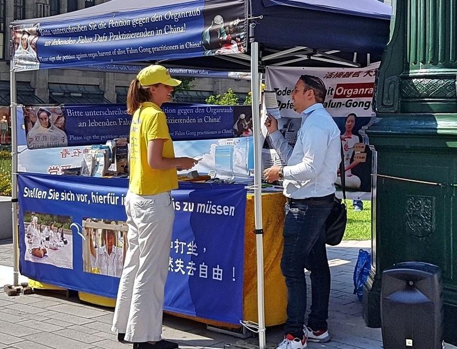 In downtown Dusseldorf practitioners later set up a booth to collect signatures on a petition calling for an end to the persecution. Local people signed to express their support after they heard about Falun Gong and the CCP's persecution.