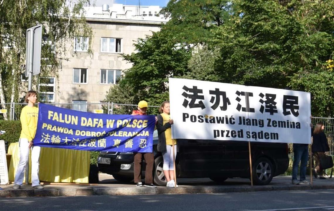 Falun Gong practitioners gathered in front of Poland's Parliament on July 18, 2019. They held banners and set up posters with information about Falun Gong in Chinese, Polish, and English.