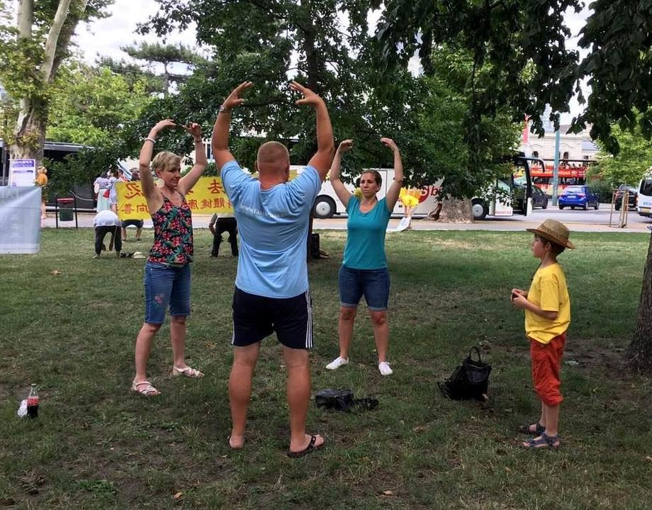 Heroes Square is a popular tourist attraction in Budapest. To let people know about the ongoing persecution in China, practitioners from Hungary demonstrated the exercises and talked with tourists in the small park next to Heroes Square on July 20, 2019.