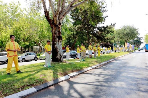 The parking lot for tour buses is adjacent to the small park where practitioners held their activities. Many Chinese tourists were surprised to see Falun Gong practitioners. Some said that they had been to several countries and saw practitioners doing the exercises, something they cannot see in China.