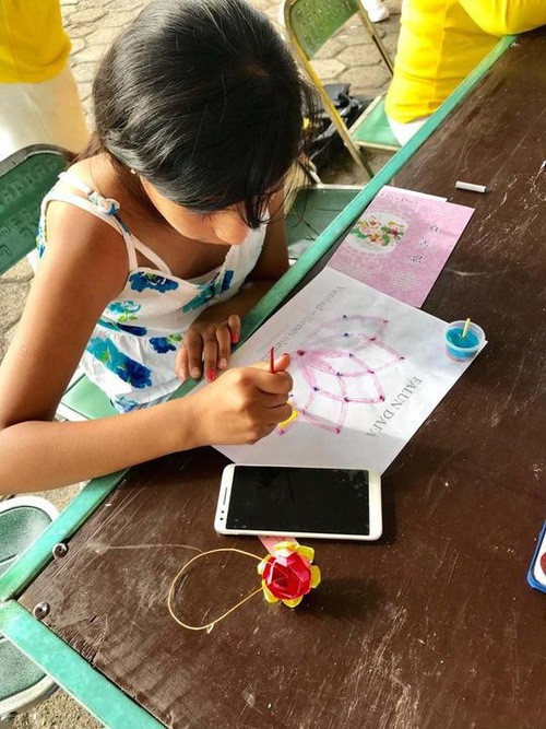 These two girls were selling meringues on the street, but after a practitioner told them about Falun Dafa, they took to coloring lotus flowers.