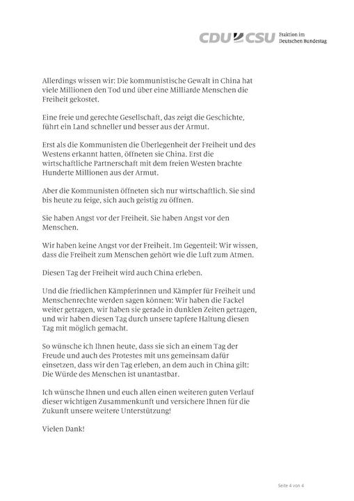 Letter from Michael Brand, spokesperson for the CDU's Committee on Human Rights and Humanitarian Aid
