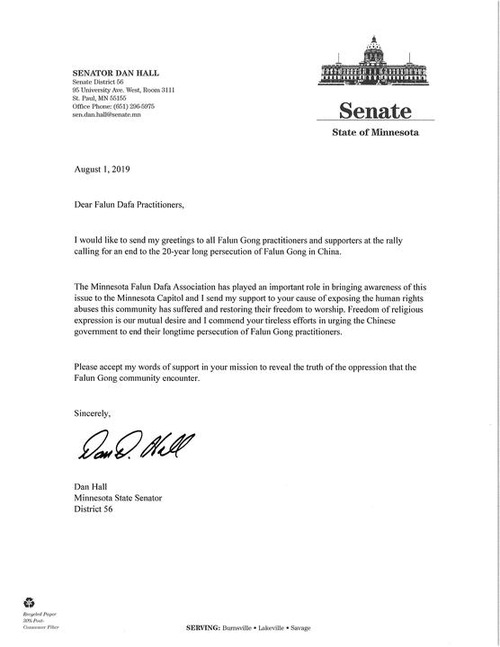 Minnesota senator Dan Hall supports practitioners' right to practice their belief. “I would like to send my greetings to all Falun Gong practitioners and supporters at the rally calling for an end to the 20-year-long persecution of Falun Gong in China. The Minnesota Falun Dafa Association has played an important role in bringing awareness of this issue to the Minnesota Capitol and I send my support to your cause of exposing the human rights abuses this community has suffered and restoring their freedom to worship,”said Sen. Hall in his letter.