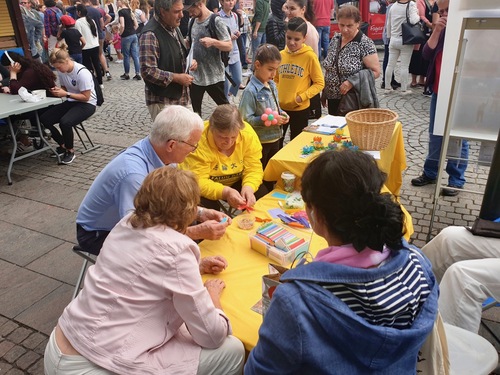 The colorful origami workshop attracted young and old. Many sat down for hours, to fold paper flowers and listen to the lotus stories narrated by one of the Falun Gong practitioners. The lotus flower has a special meaning in the Asian culture: it signifies the strength of the human spirit, which, just like the lotus flower pushing its way through the mud, cannot be suppressed and always finds its way to the surface.